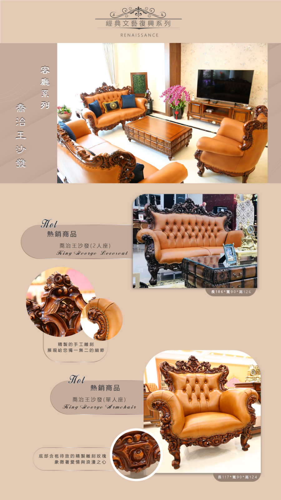 歐洲夢生活館 歐洲經典原木 喬治王沙發組