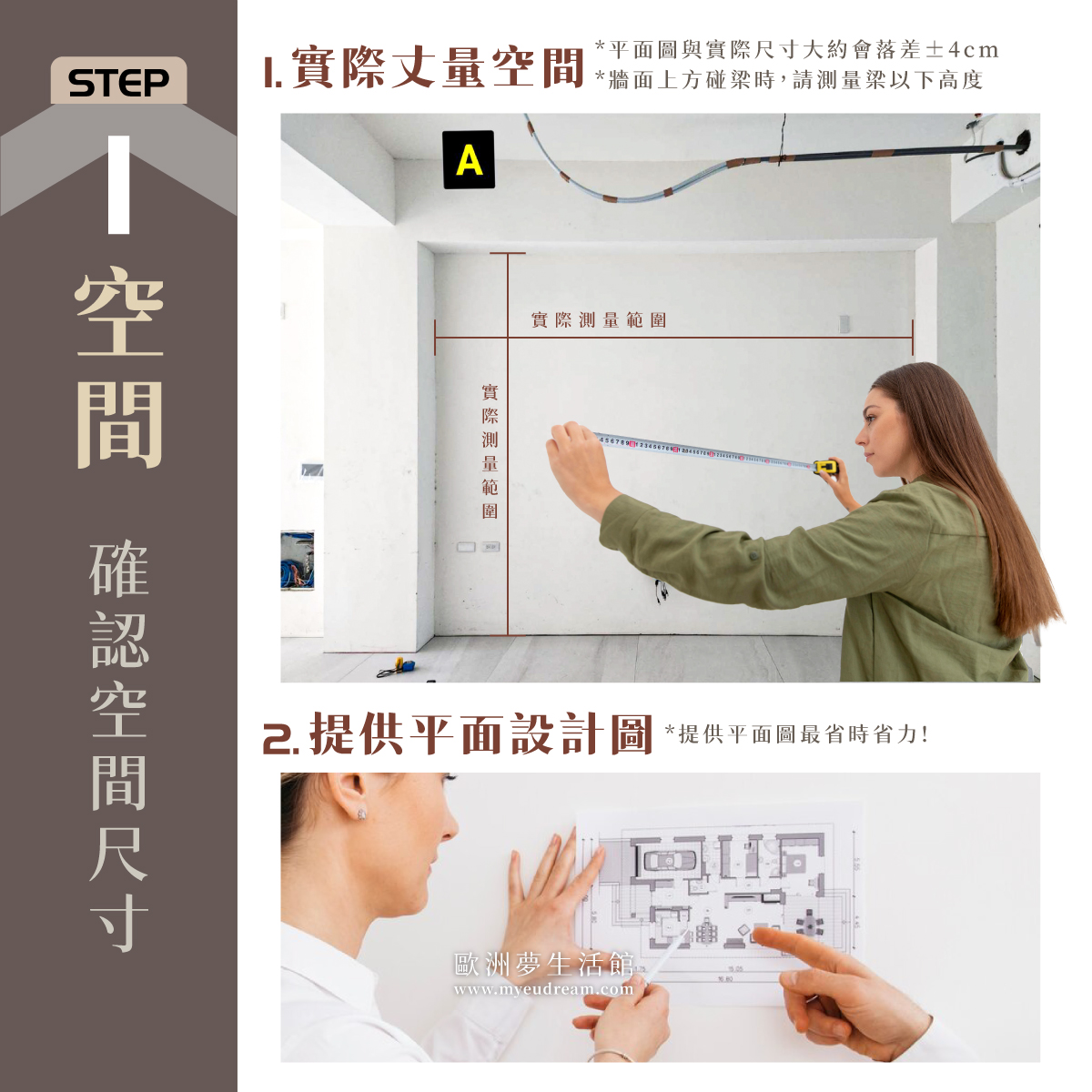 提供空間平面圖尺寸或嚮往的空間範例照片給歐洲夢的專業軟裝規劃師